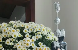 Um a um, familiares, devotos e vizinhos chegam, e cumprimentam a festeira, adentrando a sala, permanecendo de pé em sinal de ...